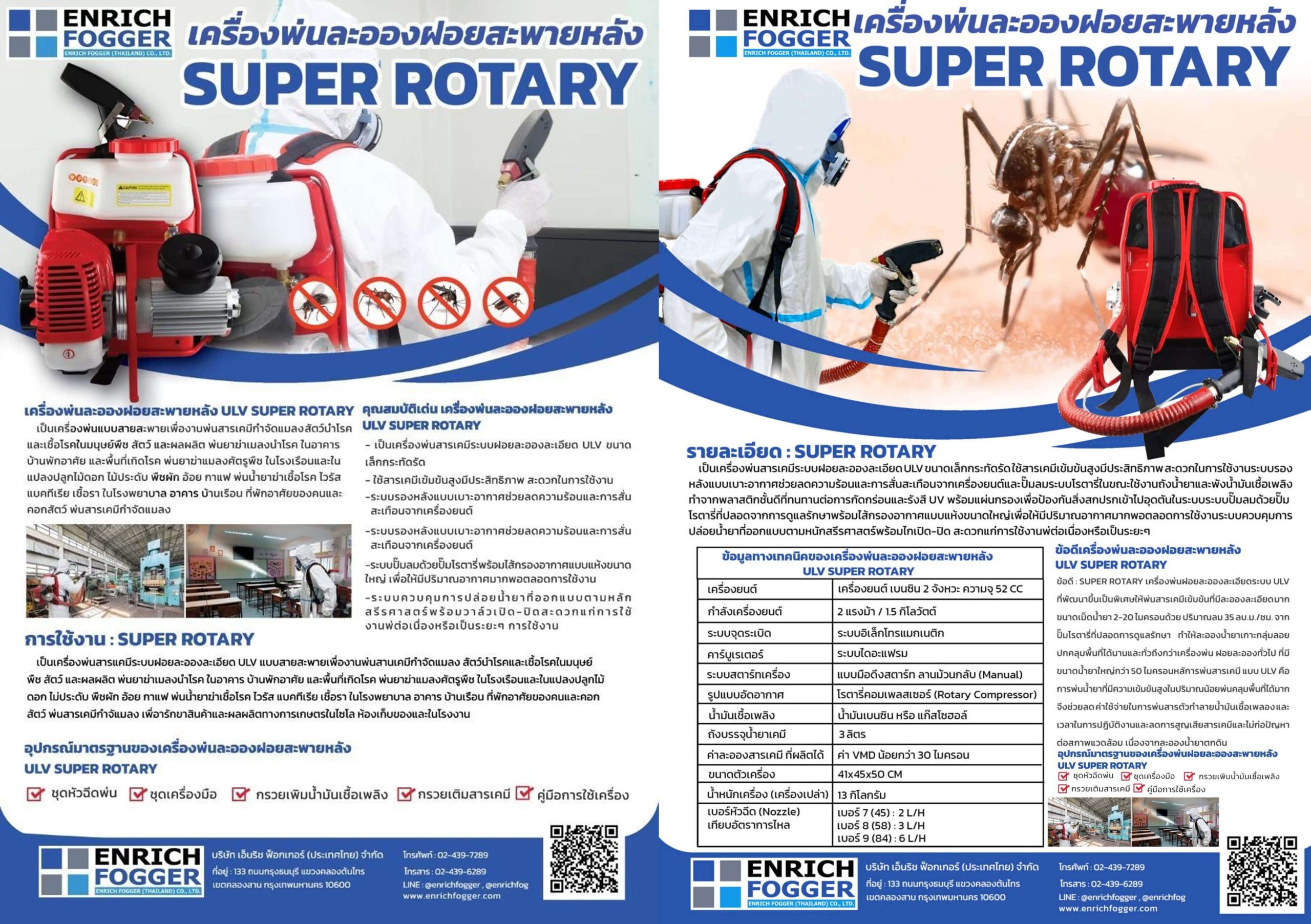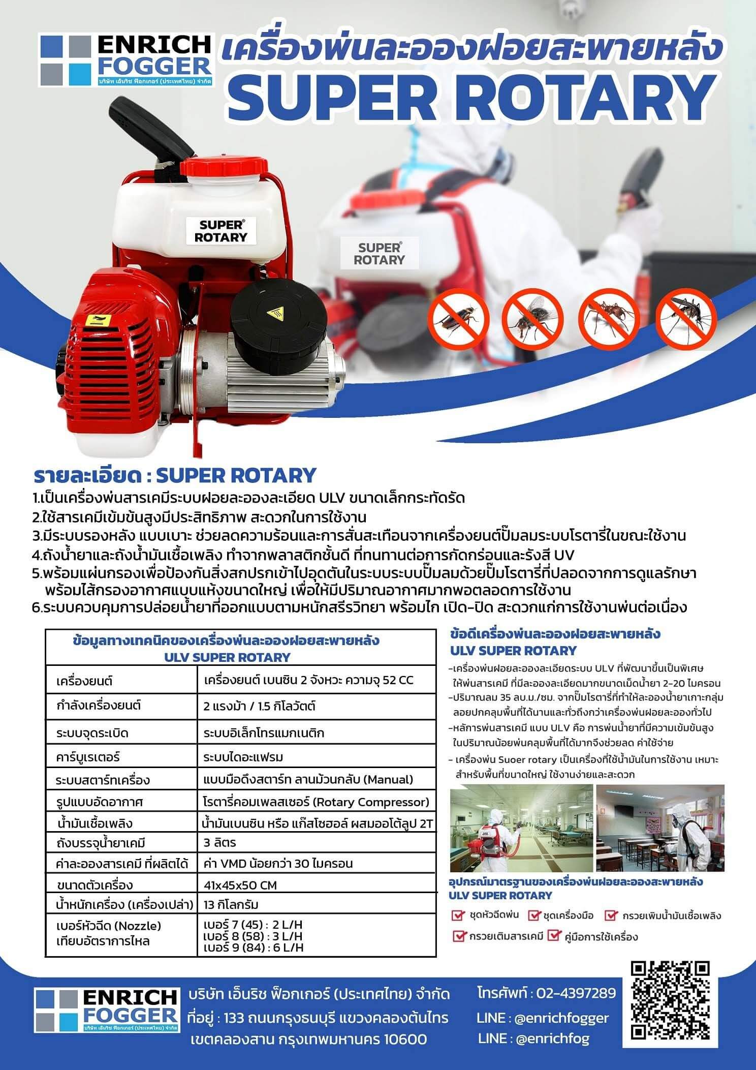 SUPER ROTARY เป็นเครื่องพ่นสารเคมีระบบฝอยละอองละเอียด ULV ขนาดเล็กกระทัดรัด ใช้สารเคมีเข้มข้นสูงมีประสิทธิภาพ สะดวกในการใช้งานระบบรองหลังแบบเบาะอากาศช่วยลดความร้อนและการสั่นสะเทือนจากเครื่องยนต์และ ปั๊มลมระบบโรตารี่ในขณะใช้งานถังน้ำยาและพังน้ำมันเชื้อเพลิงทำจากพลาสติก ชั้นดีที่ทนทานต่อการกัดกร่อนและรังสี UV พร้อมแผ่นกรองเพื่อป้องกันสิ่งสกปรกเข้าไปอุดตันในระบบ ระบบปั๊มลมด้วยปั๊มโรตารี่ที่ปลอดจากการดูแลรักษาพร้อมไส้กรองอากาศแบบแห้งขนาดใหญ่ เพื่อให้มีปริมาณอากาศมากพอตลอดการใช้งาน ระบบควบคุมการปล่อยน้ำยาที่ออกแบบตามหบักสรีรศาสตร์พร้อมไกเปิด-ปิด สะดวกแก่การใช้งานพ่ต่อเนื่องหรือเป็นระยะๆ เป็นเครื่องพ่นสารเคมีระบบฝอยละอองละเอียด ULV ขนาดเล็กกระทัดรัด ใช้สารเคมีเข้มข้นสูงมีประสิทธิภาพ สะดวกในการใช้งาน ระบบรองหลังแบบเบาะอากาศช่วยลดความร้อนและการสั่นสะเทือนจากเครื่องยนต์และปั๊มลมระบบโรตารี่ในขณะใช้งานถังน้ำยาและพังน้ำมันเชื้อเพลิงทำจากพลาสติกชั้นดีที่ทนทานต่อการกัดกร่อนและรังสี UV พร้อมแผ่นกรองเพื่อป้องกันสิ่งสกปรกเข้าไปอุดตันในระบบ ระบบปั๊มลมด้วยปั๊ทโรตารี่ที่ปลอดจากการดูแลรักษาพร้อมไส้กรองอากาศแบบแห้งขนาดใหญ่ เพื่อให้มีปริมาณอากาศมากพอตลอดการใช้งานระบบควบคุมการปล่อยน้ำยาที่ออกแบบตามหบักสรีรศาสตร์พร้อมไกเปิด-ปิด สะดวกแก่การใช้งานพ่ต่อเนื่องหรือเป็นระยะๆ หลัการพ่นสารเคมีแบบ ULV คือ การพ่นน้ำยาที่มีความเข้มข้นสูงในปริมาณน้อยพ่นคลุมพื้นที่ได้มากจึงช่วยลดค่าใช้จ่ายในการพ่นสารตัวทำลายน้ำมันเชื้อเพลอง และเวลาในการปฏิบัติงานและลดการสูญเสียสารเคมีและไม่ก่อปัญหาต่อสภาพแวดล้อม เนื่องจากละอองน้ำยาตกดินเครื่องพ่นละอองฝอยสะพายหลัง ULV SUPER ROTARY เป็นเครื่องพ่นแบบสายสะพายเพื่องานพ่นสารเคมีกำจัดแมลง สัตว์นำโรคและเชื้อโรคในมนุษย์ พืช สัตว์ และผลผลิตพ่นยาฆ่าเมลงนำโรค ในอาคาร บ้านพักอาศัย และพื้นที่เกิดโรค พ่นยาฆ่าแมลงศัตรูพืชในโรงเรือนและในแปลงปลูกไม้ดอก ไม้ประดับ พืชผัก อ้อย กาแฟ พ่นน้ำยาฆ่าเชื้อโรคไวรัส แบคทีเรีย เชื้อรา ในโรงพยาบาล อาคาร บ้านเรือน ที่พักอาศัยของคนและคอกสัตว์พ่นสารเคมีกำจัดแมลง เพื่อารักขาสินค้าและผลผลิตทางการเกษตรในไซโล ห้องเก็บของและในโรงงาน